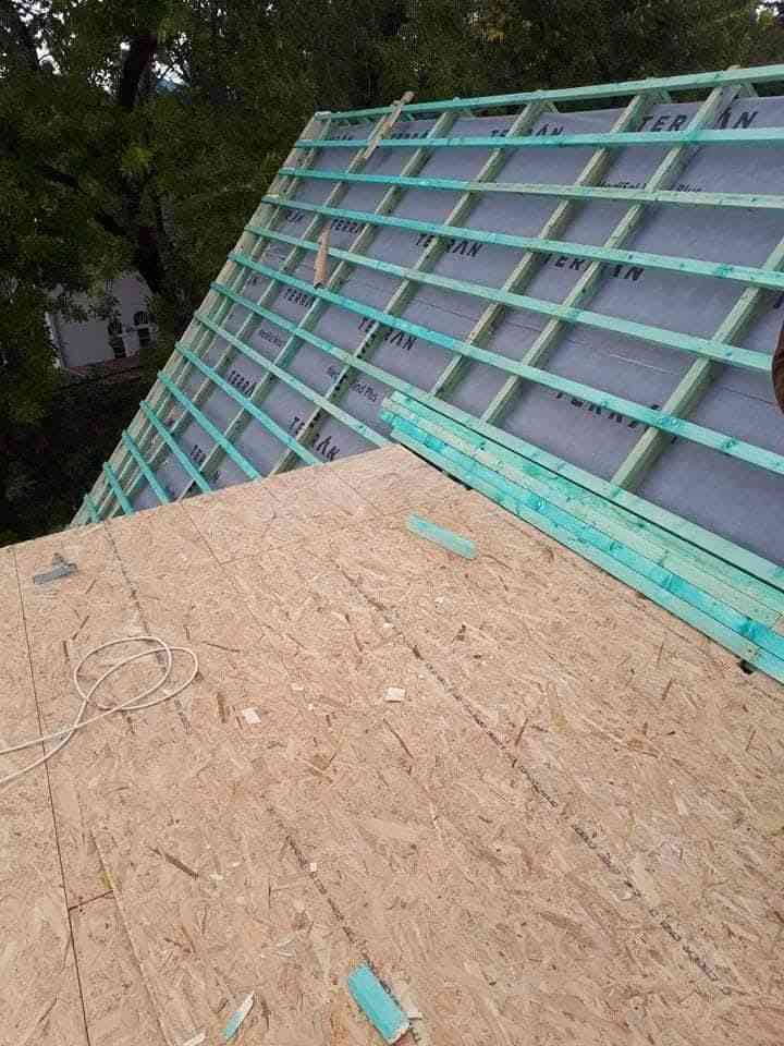 Régi tető bontása, új lécezés, páraáteresztő fólia, cserepeslemez szakszerű kivitelezéssel.